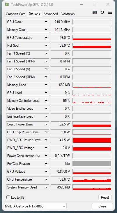 在查看 GPU-Z 时,我发现闲置时全卡功耗竟然有 52.2W!